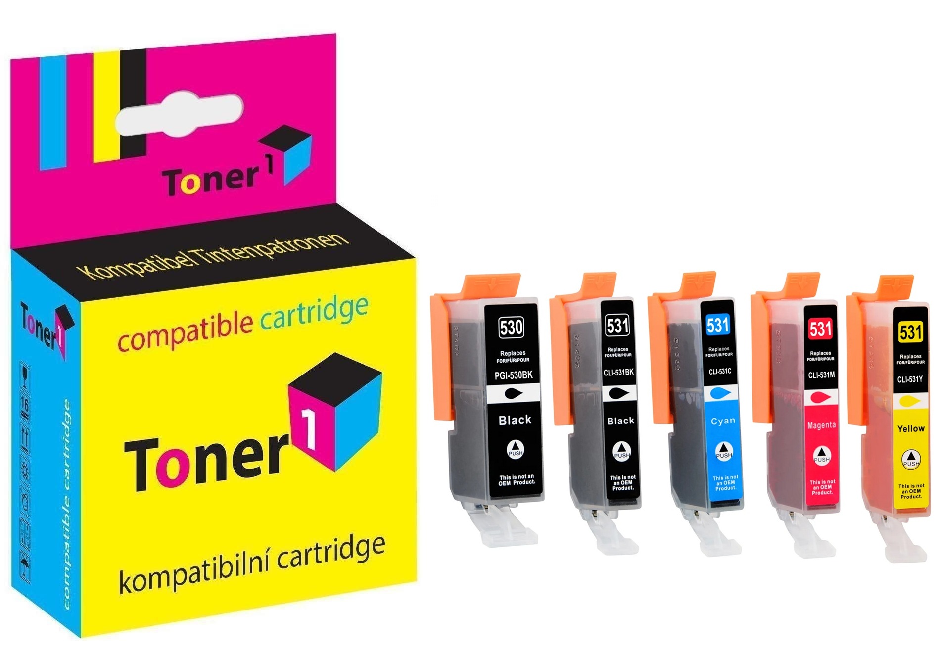 Kompatibilní cartridge české značky Toner1, vytiskne stejně kvalitně a se stejným počtem stran jako originál Canon označení PGI-530PGBK + CLI-531BK + CLI-531C + CLI-531M + CLI-531Y. Jedná se o náplně včetně nového čipu. Vyndáte originál, cvaknete tuto náplň a tisknete. Bez nutnosti přelepování čipů. Obsahuje 5 náplní (black/photo black/cyan/magenta/yellow).